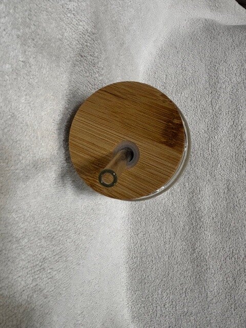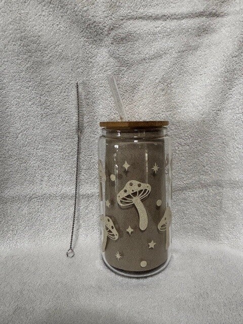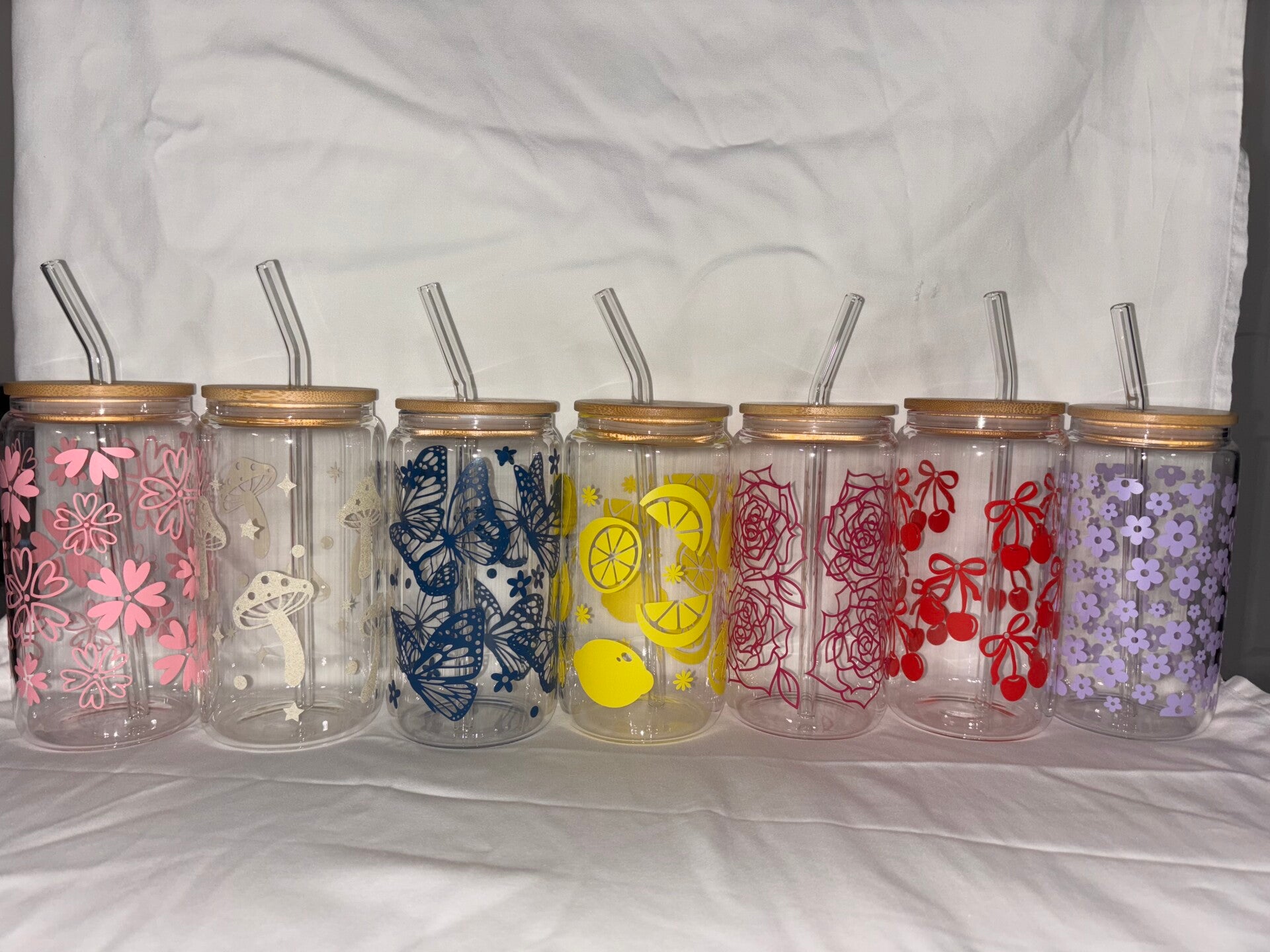 16 oz beer can glass cup with wrap around design, bamboo lid, glass straw and straw brush. Your choice of design.